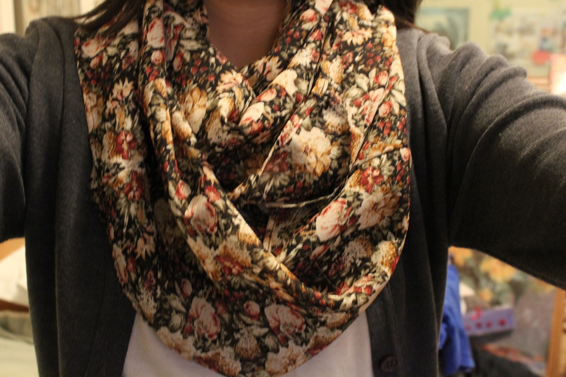 I loved the way the dress turned out, but I was left with a giant loop of floral chiffon fabric, with which I had no idea what to do. It just so happened that the day before that, a friend of mine was wearing a floral scarf, and I loved it. I decided I needed one of my own. So I tried looping the excess fabric around my neck as you would a circle scarf....