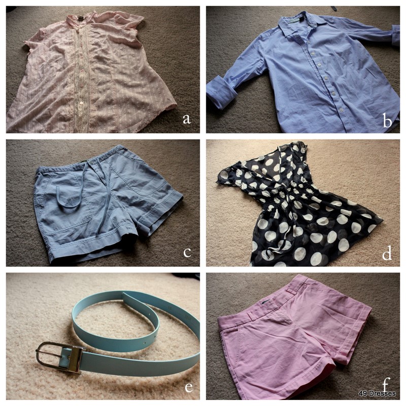 a. Pink/coral striped button down with lace trimming, $3.50; b. Eddie Bauer striped blue button down, $3.50; c. Eddie Bauer dusty blue shorts, $3; d. Forever 21 sheer polka dot top, $3.50; e. baby blue belt, $1; f. J. Crew shorts, $3. |